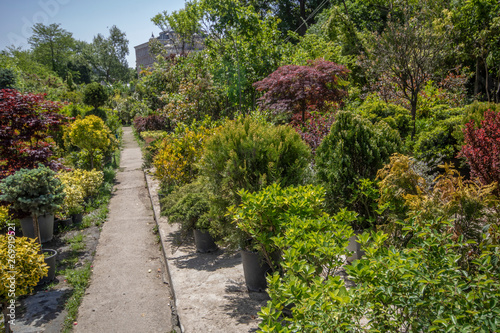 Concrete road in the middle of a botanical market. There are different kinds of plants. Taken in spring.