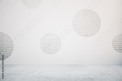 interior, empty, wall, patterned, creative, three-dimensional, rendering, render, illustration, loft, real, estate, apartment, architecture, room, design, office, home, house, residential, nobody, blank, mock, up, copy space, template, pattern, wooden, floor, brick, indoor, inside, clean, new, domestic, contemporary, modern, lifestyle, decorative, minimalistic, living, style, round, circle
