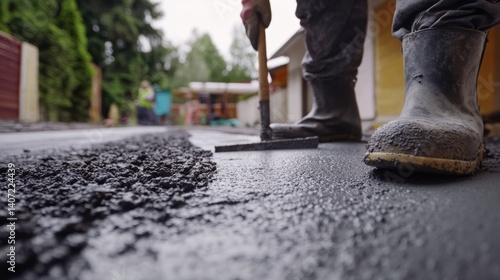 Concrete worker smoothing freshly poured concrete for a driveway. Featuring skill and focus