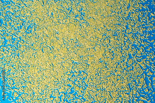 confectionery sprinkles yellow sugar grains on a blue background.