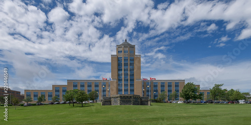 architecture, blue, building, canada, capitol, cloud, contemporary, day, daytime, entrance, exterior, facades, front, glasses, government, grass, green, horizontal, labrador, landmark, lawn, modern, newfoundland, nobody, outdoors, outside, panorama, panoramic, politic, sky, summer, tower, white