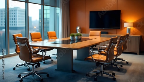 conference room, room, table, chair, meet, modern, clean, professional, bright, window, building, city landscape, pot, plant, cabinet, lamp, television, orange, brown, grey, interior, office, work, meeting, presentation, collaboration, discussion, teleconference, corporate, boardroom, executive, strategy, planning