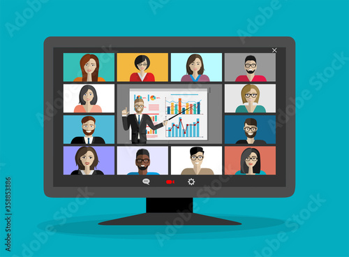 business, cartoon, chat, colleague, communication, computer, concept, conference, connection, conversation, corona, corporate, course, creativity, design, digital, discussion, distance, distant, diversity, education, employee, friends, graphic, group, having, hold, home, illustration, information, cyberspace, laptop, lesson, media, meeting, office, online, person, presentation, quarantine, screen, seminar, talking, team, technology, vector, video, web, working