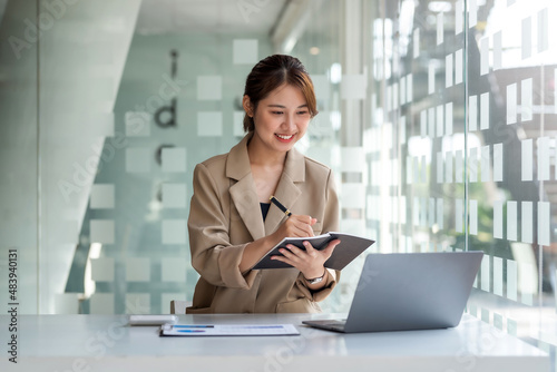 Confident and beautiful young Asian businesswoman sitting taking notes in notepad with laptop computer at office.