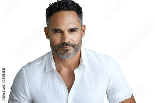 Confident and stylish man with short black hair and trimmed beard wearing a crisp white shirt, modern fashion portrait, isolated on transparent background
