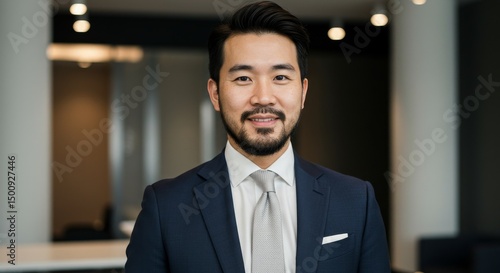 Confident Asian Businessman Portrait - A portrait of a smiling Asian businessman in a dark suit and light gray tie, set against a blurred office background