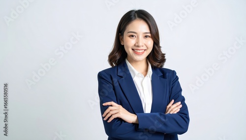 Confident Asian businesswoman in blue suit, arms crossed, smiling against white background