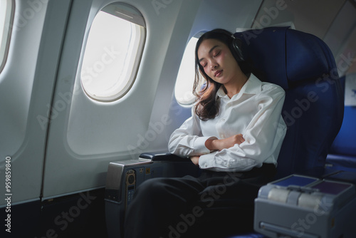 Confident Asian businesswoman sitting in business class luxury plane while wearing wireless headphones to relax Listen to music and work on your personal online business during international flights.
