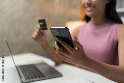 Confident Asian businesswomen sitting at their desks Are using banking applications to buy or pay online mobile bills. and registered her credit card on the website for online purchases.