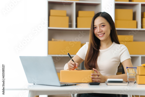 Confident Asian china people SME owner diligently packing products into boxes, epitomizing the e-commerce shift. As orders flood her inbox
