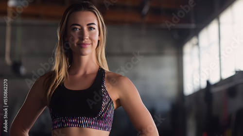 Confident athletic woman in workout clothes, gym setting. Strength and determination in fitness.
