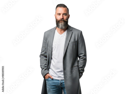 Confident bearded man in gray coat standing with hands in pockets isolated on transparent background