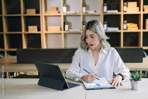 Confident beautiful Asian businesswoman typing laptop computer and digital tablet while holding coffee at office.