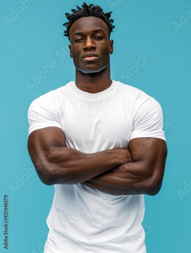 black man, confident, african american, portrait, studio shot, blue background, muscular, strong, powerful, determination, success, professional, business, male, model, fashion, casual attire, trendy, serious, head shot, closeup, isolated, arms crossed, body language