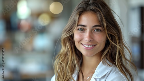 confident brunette doctor in a white coat stands smiling professionally in a well lit office.image illustration