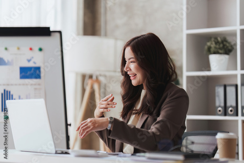 Confident business person executive using laptop computer, having video conference call virtual meeting, advisor finance, research, fund