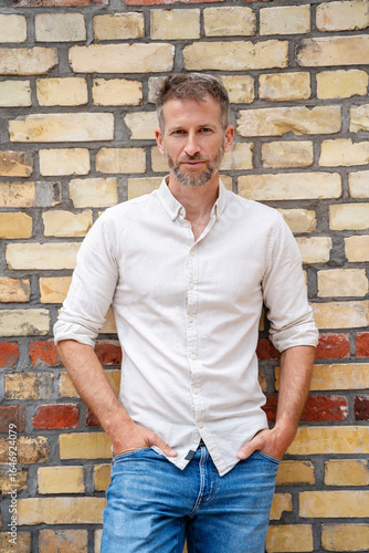 confident, business, professional, white, shirt, standing, brick, wall, smiling, copy space, 1, people, adult, man, mid, office, professionalism, leadership, occupation, city, caucasian, notepad, businessman, success, modern, casual attire, self-confidence, job, men at work, beard, graying, confidence, outdoors, urban, background, lifestyle, style, male, attitude