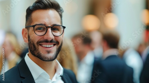 Confident business professional wearing glasses, smiling at a corporate networking event, surrounded by blurred people in the background.