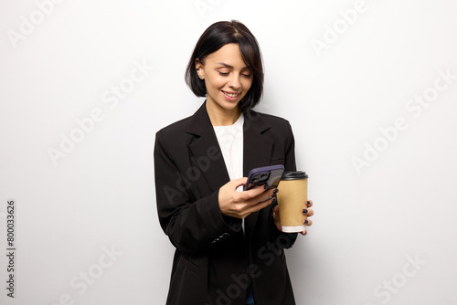 background, female, business, portrait, woman, happy, beautiful, smartphone, cup of coffee, break, read, chat, young, person, pretty, smiling, isolated, attractive, posing, brunette, people, studio, caucasian, confident, businesswoman, adult, suit, beauty, sexy, shirt, businessperson, woman, european, copy space