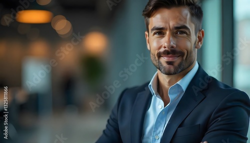 Confident Businessman: A distinguished businessman exudes confidence and professionalism, his engaging gaze hinting at ambition and leadership in a modern office setting.