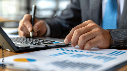 confident, businessman, canvasses, financial, report, business, man, laptop, calculating machine, paperwork, budget, service, expert, number, find, forecast, market, consult, client, figure, outcome, advice, expense, account, profit, solve, asset, balance, datum, success, hand, closeup