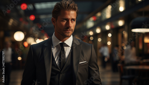 Confident businessman in a suit, outdoors, looking at camera generated by AI