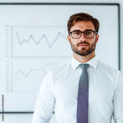 Confident businessman in formal attire standing in office with business graphs in the background. Professional and modern atmosphere.