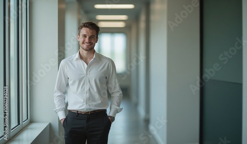 professional, corporate, workplace, corridor, success, leadership, confidence, hallway, window, light, indoor, career, executive, young, male, caucasian, standing, pose, shirt, slack, employee, office, modern, contemporary, business, portrait, smile, positive, optimistic, ambitious, friendly, approachable, charismatic, successful, entrepreneur, manager, white-collar, formal, attire, dressed-up, clean-cut, well-groomed, photogenic