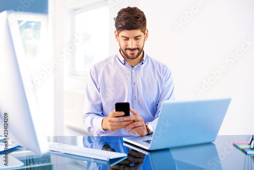 Confident businessman using his mobile phone and text messaging while working on laptop