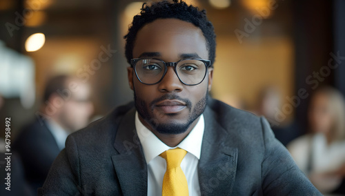 Confident businessman wearing glasses and a suit, exuding professionalism and focus in a modern office environment.