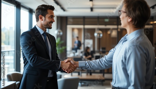 handshake, businessman, office, professional, modern, portrait, meeting, agreements, deal, contract, success, partnership, collaboration, corporate, confident, optimistic, elegant, formal, attire, suit, shirt, attaching, man, negotiation, commerce, business, marketing, sale, finance, investment, management, leadership, strategy, growth, teamwork, achievement, professionalism