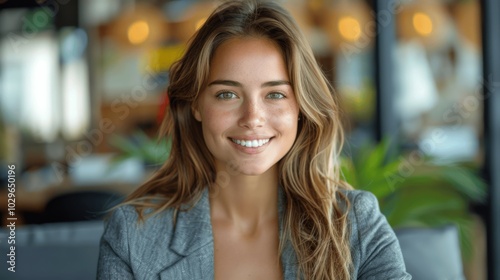 Confident businesswoman in grey blazer sitting in modern office with plants