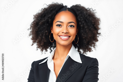 woman, business, career, professional, portrait, smiling, happy, confident, successful, black, hair, curly, african, businesswoman, formal, suit, style, power, positive, beauty, attractive, empowerment, leadership, modern, face, natural, studio, accessory, jewellery, gold