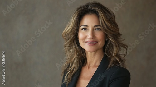 Confident Businesswoman with Elegant Brown Hair Posing in Professional Attire Against a Textured Background for Corporate or Lifestyle Imagery