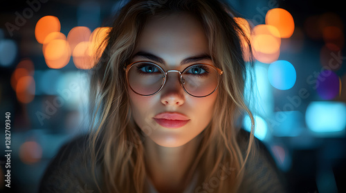 Confident businesswoman working late in a high-tech office, productivity and ambition