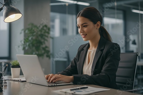 Confident Businesswoman Working on Laptop in a Modern Office, Focused on Productivity, Success, and Professional Growth
