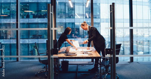Confident coworking diverse entrepreneurs checking paper reports in office