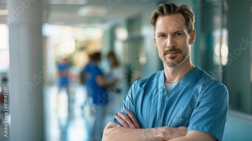 health care, man, professional, portrait, male, doctor, medicine, medicals, career, indoor, confident, hospital, work, uniform, adult, blue, serious, clinic, caucasian, corridor, expertise, stethoscope, person, scrub, staff, trust, practitioner, clean, standing, healthcare professional, provider, arms crossed, medico, competence, assured