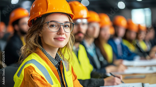 woman, female, engineer, architect, construction, helmet, safety, vest, conference, meeting, team, group, people, professional, business, industry, building, men at work, job, career, portrait, face, smile, goggles, confident, skilled, expertise, technology, development, project, planning, design, training, education, workshop, seminar, corporate, success, leadership, management, collaboration, teamwork, innovation, future, progress