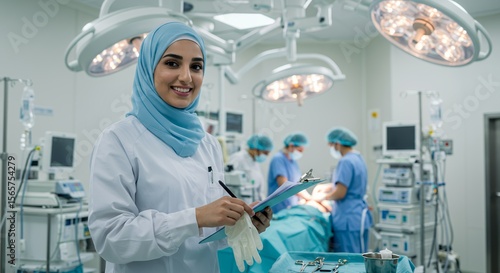 Confident female surgeon in hijab smiles while reviewing patient notes in a modern operating room.