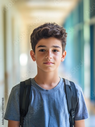Confident junior high boy student in bright corridor with natural light, wearing gray t-shirt and backpack, empty space for text background.
