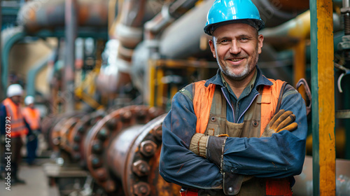 men at work, industrial, engineer, manufacturing, hard, hat, plant, male, smiling, industry, machinery, safety, professional, equipment, factory, labor, job, occupation, technician, skilled, craftsmanship, manual, uniform, protective, gear, happiness, blue, collar