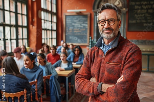 teacher, classroom, student, learning, education, racked, confident, male, smile, arms crossed, desk, lecture, class, university, college, school, teaching, cognition, instructor, prof, mentor, academic, higher education, academic year