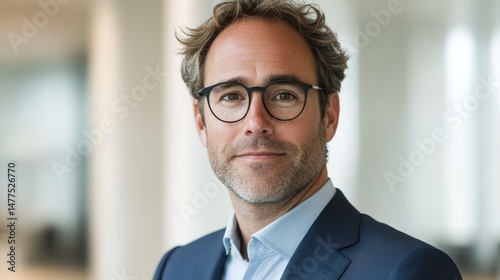 Confident man in a suit and glasses looks at the camera. Use to depict leadership, business acumen, and trustworthiness.