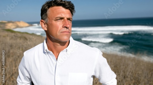 Confident man in white shirt gazes thoughtfully at the seaside landscape