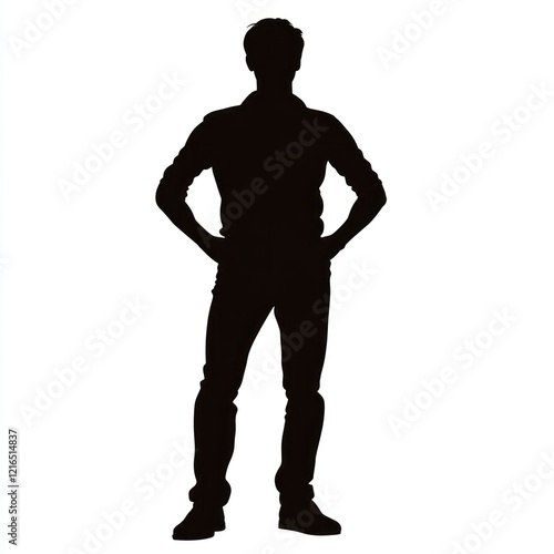 Confident man silhouette, hands on hips, white background, profile graphic.