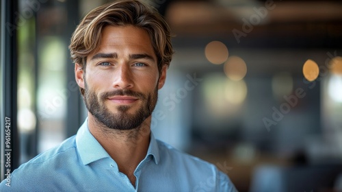 man, smiling, indoor, workspace, office, contemporary, professional, confident, casual attire, facial expression, natural light, background, interior, business, charisma, engagement, atmosphere, aesthetic, portrait, young adult, communication, happy, relaxed, friendly, teamwork, inspiration, motivation, confidence, individuality, self-assured, focused, ambition, professionalism, interior design, networking