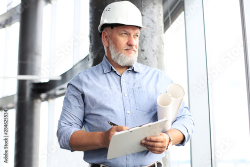Confident mature business man in hardhat holding blueprint and looking away while standing indoors.