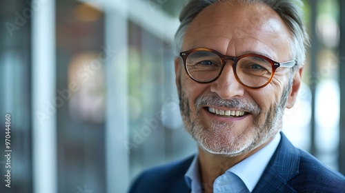 Confident Mature Businessman with Glasses, Smiling, Business Theme, Portrait Shot, Plain Office Background, Glasses