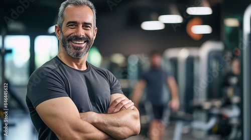 fitness, trainer, gym, wellness, health, physical exercise, middle-aged, male, smiling, modern, exercise, equipment, confidence, happy, muscular, professional, background, active, lifestyle, coach, training, strength, sport, athlete, healthy, indoor, physical, activity, motivation, instruction, inspiration, guidance, routine, determination, positivity, mature, dynamic, energy, bodybuilding